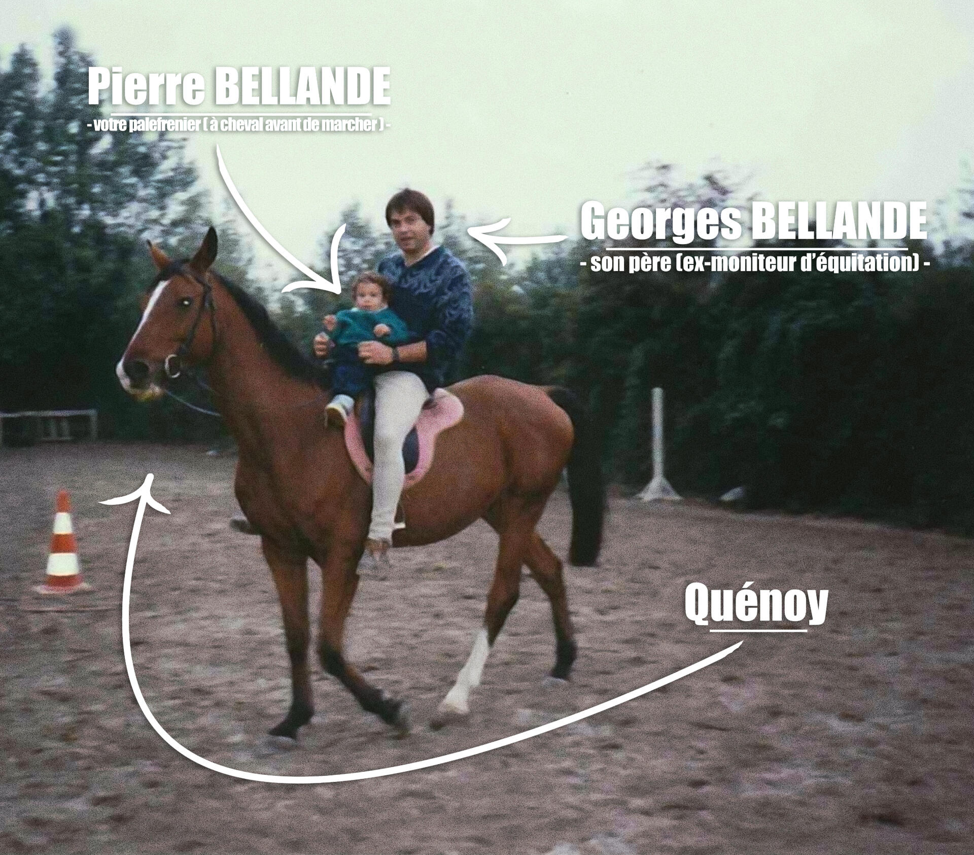 Vous avez pu admirer l'allure fière de mon arrière-arrière-grand-père Auguste sur la page d'accueil. Me voici maintenant, pour probablement l'une de mes premières fois à cheval. J'ai un peu grandi depuis :) Quand mon aïeul a acheté la ferme, ce n'était pour lui qu'un cabanon de chasse. C'est mon père qui en a fait un centre équestre.Aujourd'hui c'est moi qui reprend les rênes. Etre né au milieu des équidés m'apporte je le pense, une capacité innée à comprendre et prendre soin d'eux. Pour autant, il est évident que l'on arrête jamais d'apprendre auprès d'eux. Et c'est pourquoi, je suis toujours ravi d'échanger à ce sujet. Je met d'ailleurs un point d'honneur à garder une ambiance conviviale sur la ferme, propice aux échanges.La ferme s'articule autour de deux activités: