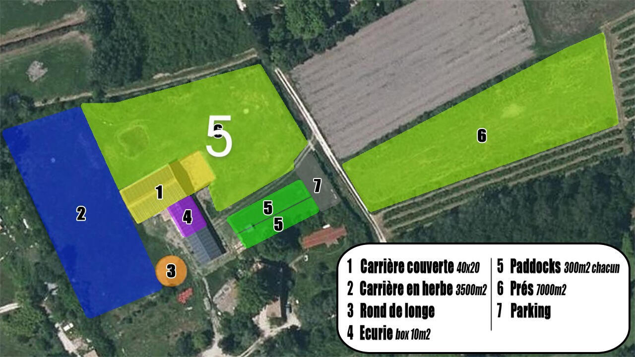 D'une part l’écurie de dix boxs, qui comprend un manège couvert, un rond de longe et de nombreux circuits de balade. À terme un club-house, une carrière d'obstacle, et d'autres surprises.